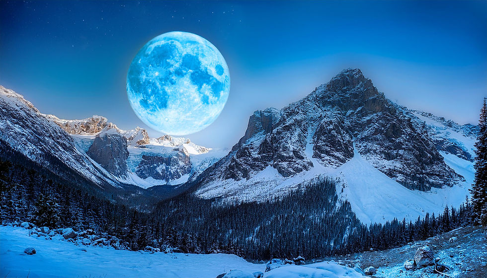 The Rocky Mountains with lots of snow with a Large Blue Full Moon.
